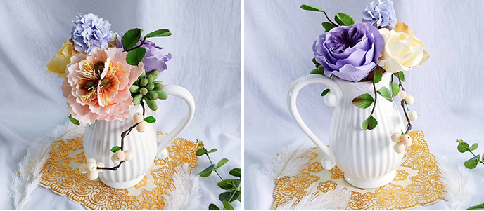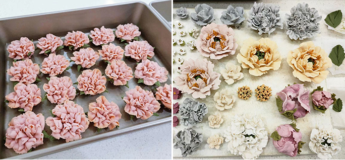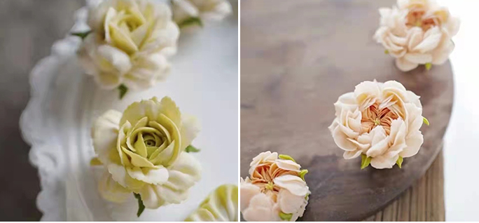 豆沙霜制作、调色方法、芍药花苞、自然系牡丹、玫瑰、棉花、叶子、枝条、玫瑰花苞、风车果、康乃馨、扶朗花、磅蛋糕胚体制作、调味奶油霜制作、组装整款韩裱蛋糕