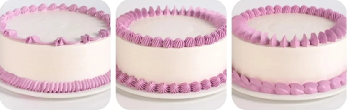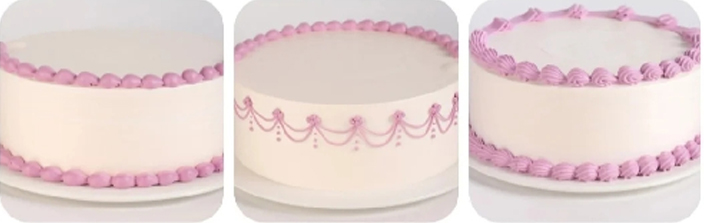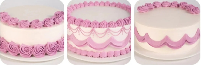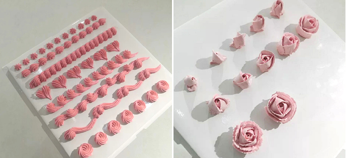 直角胚抹面、一刀收、抹面基本功、心形蛋糕裁制、心形胚抹面练习、心形胚练习、弧形胚练习、方形抹胚练习、贝壳、爱心、树叶、树藤、吊边、花篮边、曲奇玫瑰、星星边、绳边、反八字边、奶油字体、裙边、豆边、玫瑰花、牡丹、大丽花、向日癸、百合、五瓣花、康乃馨